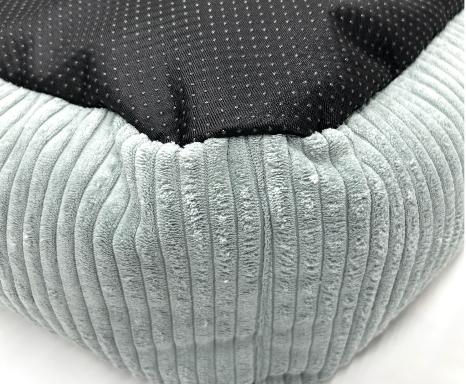 Der Bezug besteht aus kuscheligem, aber robustem Cordstoff, der nicht nur besonders strapazierfähig ist, sondern auch eine warme, einladende Haptik bietet. Er lässt sich komplett abnehmen und ist maschinenwaschbar bei 30 °C, was für perfekte Hygiene sorgt. Der Unterboden des Bettes ist zudem mit rutschfestem Material ausgestattet, damit es sicher an Ort und Stelle bleibt.